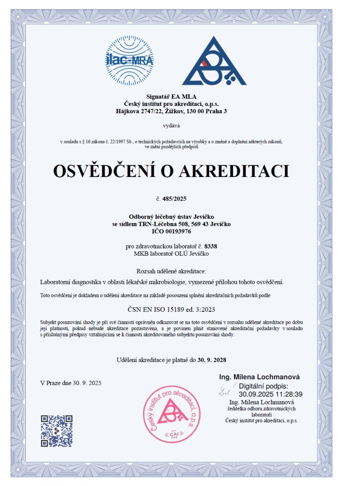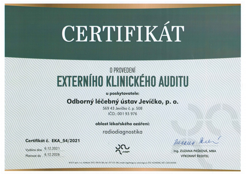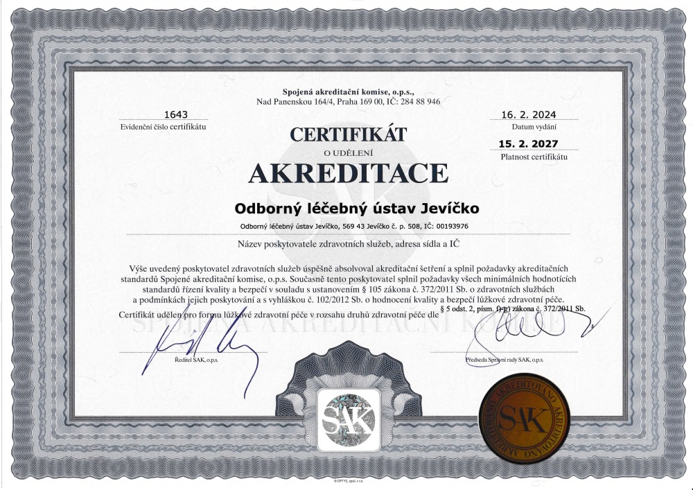 Certifikát kvality a bezpečí poskytované zdravotní péče jsme obhájili již potřetí. První certifikát jsme obdrželi v roce 2017. Splněním akreditačních standardů jsme opět potvrdili, že je v naší léčebně poskytována pacientům péče na vysoké a odborné úrovni. Získání certifikátu bylo odměnou pro všechny zaměstnance OLÚ Jevíčko za tříletou práci, úsilí, pečlivost a trpělivost při poskytování péče našim pacientů.