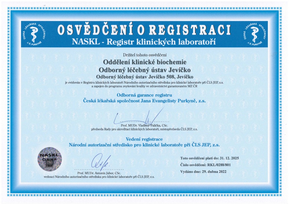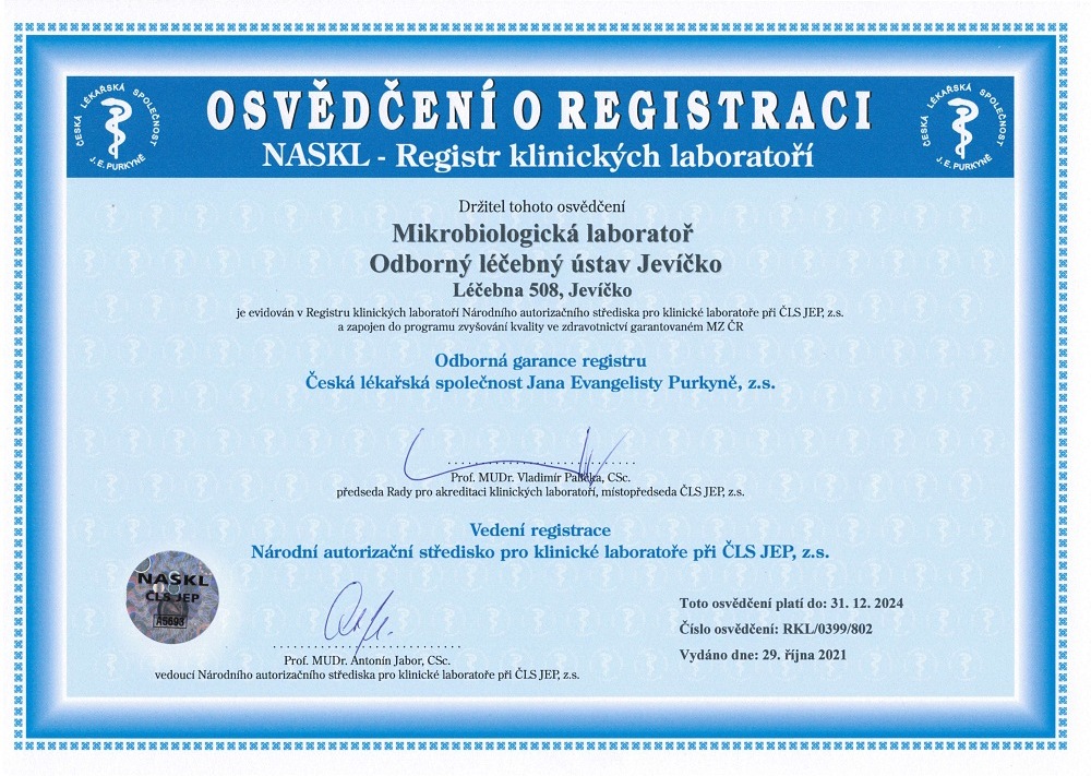 Naše laboratoře, mikrobiologická a biochemická, pravidelně obhajují certifikát kvality, který je potvrzením, že mají zavedený řízený systém kvality podle standardů. Pro úspěšné získání osvědčení je nutné splňovat podmínky, týkající se především personálního zabezpečení, vedení a vzdělávání, vyšetřovacích postupů a následné kontrolní činnosti.